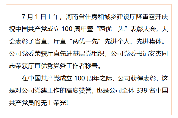 公司黨委榮獲廳直先進(jìn)基層黨組織 安杰同志榮獲廳直優(yōu)秀黨務(wù)工作者稱號