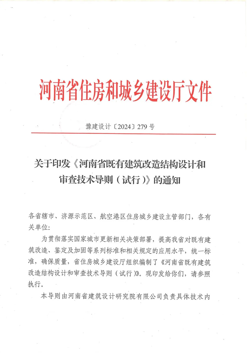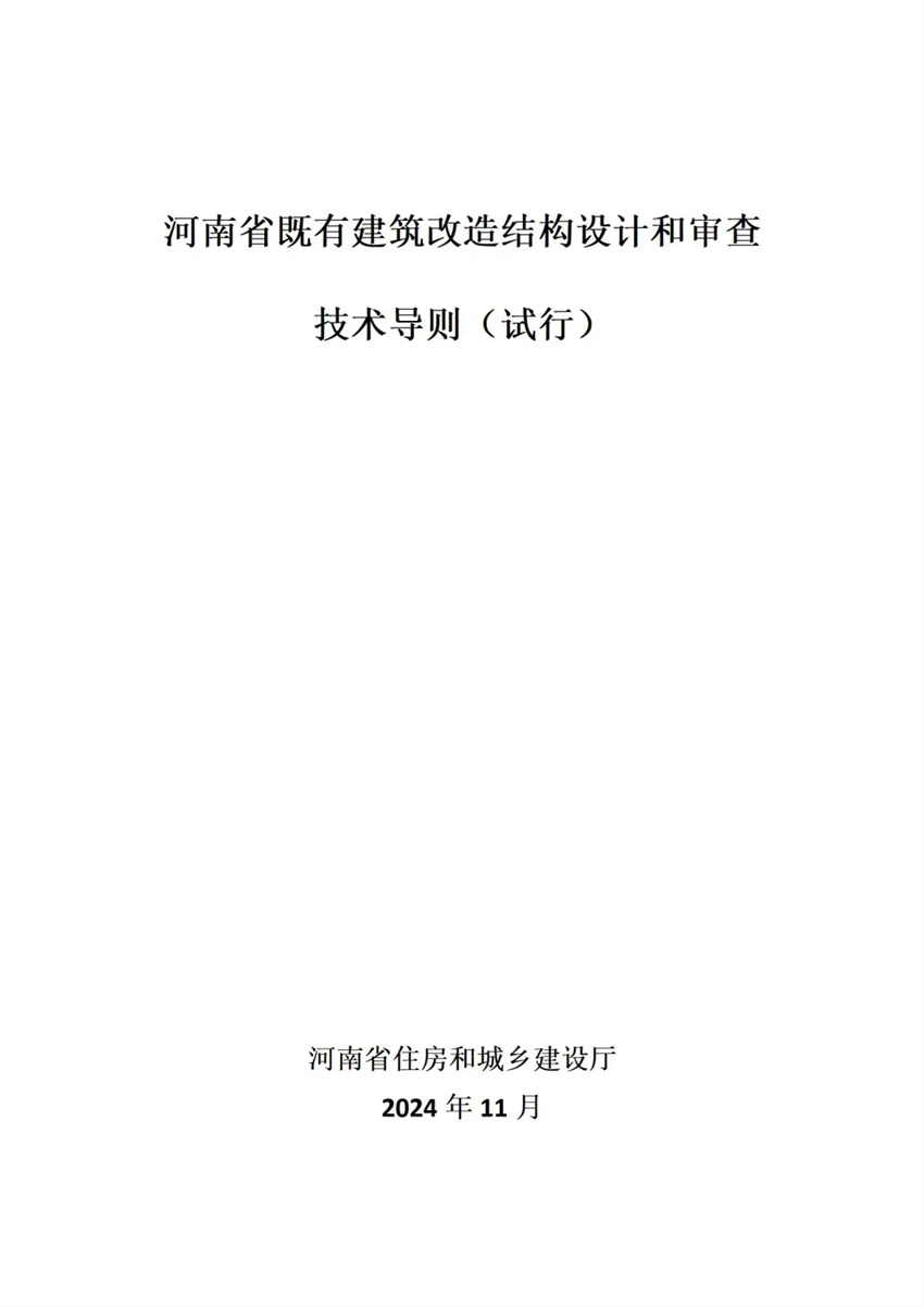 2024年11月29日,由河南省建筑設(shè)計(jì)研究院有限公司等單位編制的《河南省既有建筑改造結(jié)構(gòu)設(shè)計(jì)和審查技術(shù)導(dǎo)則(試行)》獲河南省住房和城鄉(xiāng)建設(shè)廳批準(zhǔn)并正式印發(fā)各地建設(shè)主管部門等有關(guān)單位。