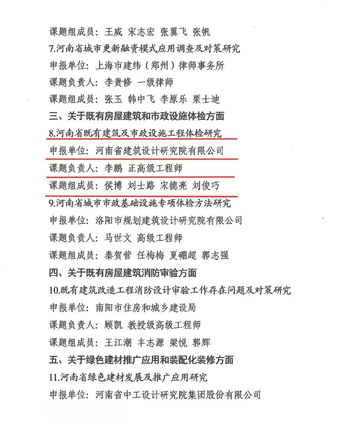 2025年8月,河南省住房和城鄉(xiāng)建設(shè)廳印發(fā)《關(guān)于2024年城市更新和住房城鄉(xiāng)建設(shè)高質(zhì)量轉(zhuǎn)型發(fā)展課題結(jié)項的通知》(豫建辦〔2025〕162號),正式公布課題評審結(jié)果。河南省院申報的《河南省既有建筑及市政工程體檢研究》課題經(jīng)專家嚴格評審,順利通過驗收,成功結(jié)項。