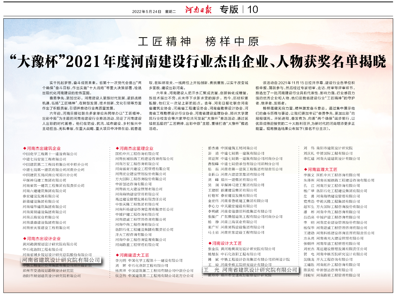 該活動(dòng)自2021年11月15日拉開(kāi)序幕,經(jīng)過(guò)專(zhuān)家初審、走訪、終審等評(píng)審環(huán)節(jié),推選出了一批河南建設(shè)行業(yè)具有代表性、影響力強(qiáng)、行業(yè)感召力強(qiáng)的優(yōu)秀企業(yè)和人物。河南省建筑設(shè)計(jì)研究院有限公司榮獲“大豫杯”2021年度河南杰出設(shè)計(jì)企業(yè),公司副總建筑師王光榮獲河南設(shè)計(jì)大工匠稱(chēng)號(hào)。