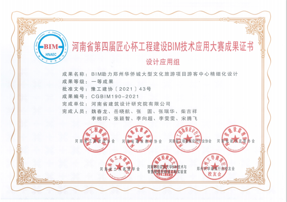 公司 第三分院 BIM技術(shù)應(yīng)用中心 榮獲河南省第四屆匠心杯競(jìng)賽設(shè)計(jì)組一等成果,獲獎(jiǎng)項(xiàng)目為“BIM技術(shù)助力鄭州中原華僑城大型文化旅游項(xiàng)目游客中心精細(xì)化設(shè)計(jì)”。