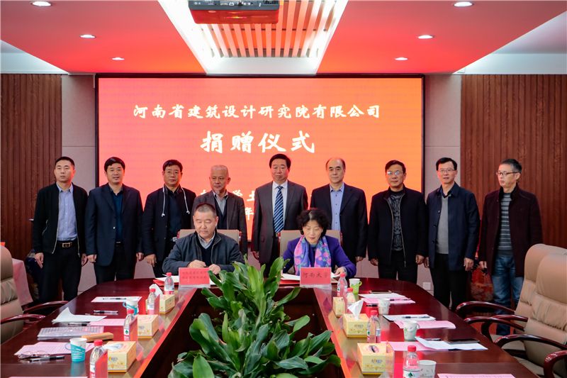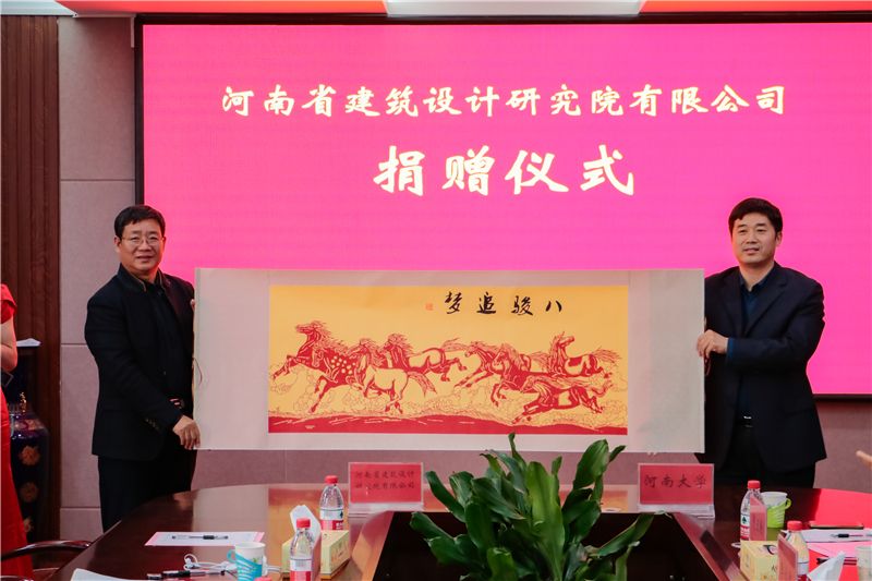 儀式上,河南省建筑設(shè)計(jì)研究院有限公司總工程師蔡黎明代表公司簽訂了捐贈(zèng)協(xié)議,并接受了捐贈(zèng)證書和紀(jì)念杯;河南大學(xué)土木建筑學(xué)院黨委書記李社教接受捐贈(zèng)。公司財(cái)務(wù)總監(jiān)韓兆海接受了河南大學(xué)土木土木建筑學(xué)院院長(zhǎng)岳建偉代表學(xué)校回贈(zèng)的“八駿追夢(mèng)”圖。