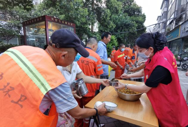 志愿者們依次發(fā)放饅頭、盛菜、盛粥,整個(gè)過(guò)程井然有序,忙而不亂。一聲聲“早上好!您辛苦了”,一碗碗愛(ài)心粥帶著健康與祝福,簡(jiǎn)單而美味,讓人感覺(jué)到滾滾暖流,師傅們連聲表示感謝,臉上也洋溢著幸福的笑容。隨后,志愿者們還上門為年齡較大、行動(dòng)不便的獨(dú)居老人送去了熱騰騰、可口的飯菜。待大家用餐結(jié)束后,志愿者們及時(shí)把桌椅整理入庫(kù),打掃好現(xiàn)場(chǎng)的衛(wèi)生,做好最后的工作。