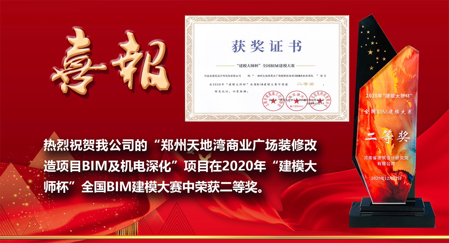 熱烈祝賀我公司的“鄭州天地灣商業(yè)廣場裝修改造項目BIM及機電深化”項目在2020年“建模大師杯”全國BIM建模大賽中榮獲二等獎