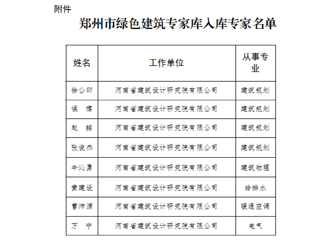 《鄭州市城鄉(xiāng)建設(shè)局關(guān)于鄭州市綠色建筑專家?guī)烊霂?kù)專家名單的通告》(鄭建文〔2023〕8號(hào))現(xiàn)已發(fā)布,河南省建筑設(shè)計(jì)研究院有限公司徐公印、侯博、趙喆、張俊杰、牛沁勇、黃建設(shè)、曹沛源、萬(wàn)寧入選鄭州市綠色建筑專家。