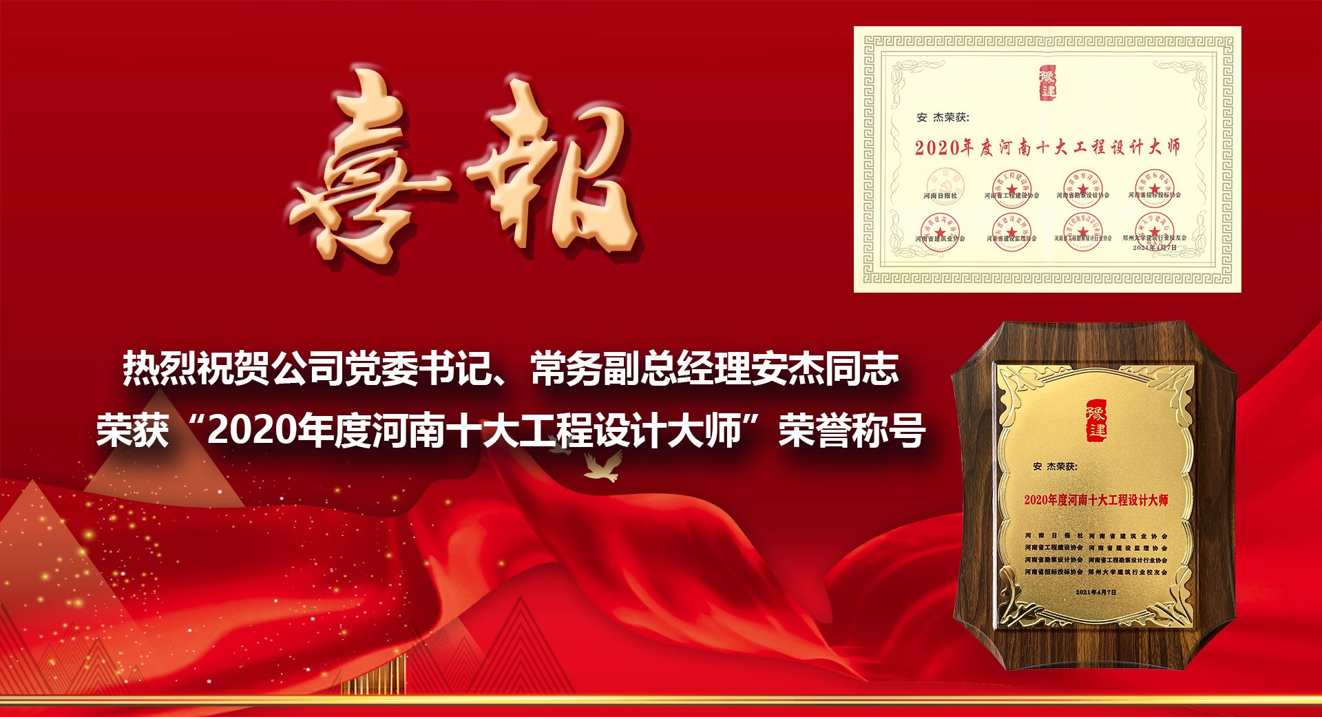 公司黨委書記、常務副總經理安杰同志榮獲“2020年度河南十大工程設計大師”榮譽稱號