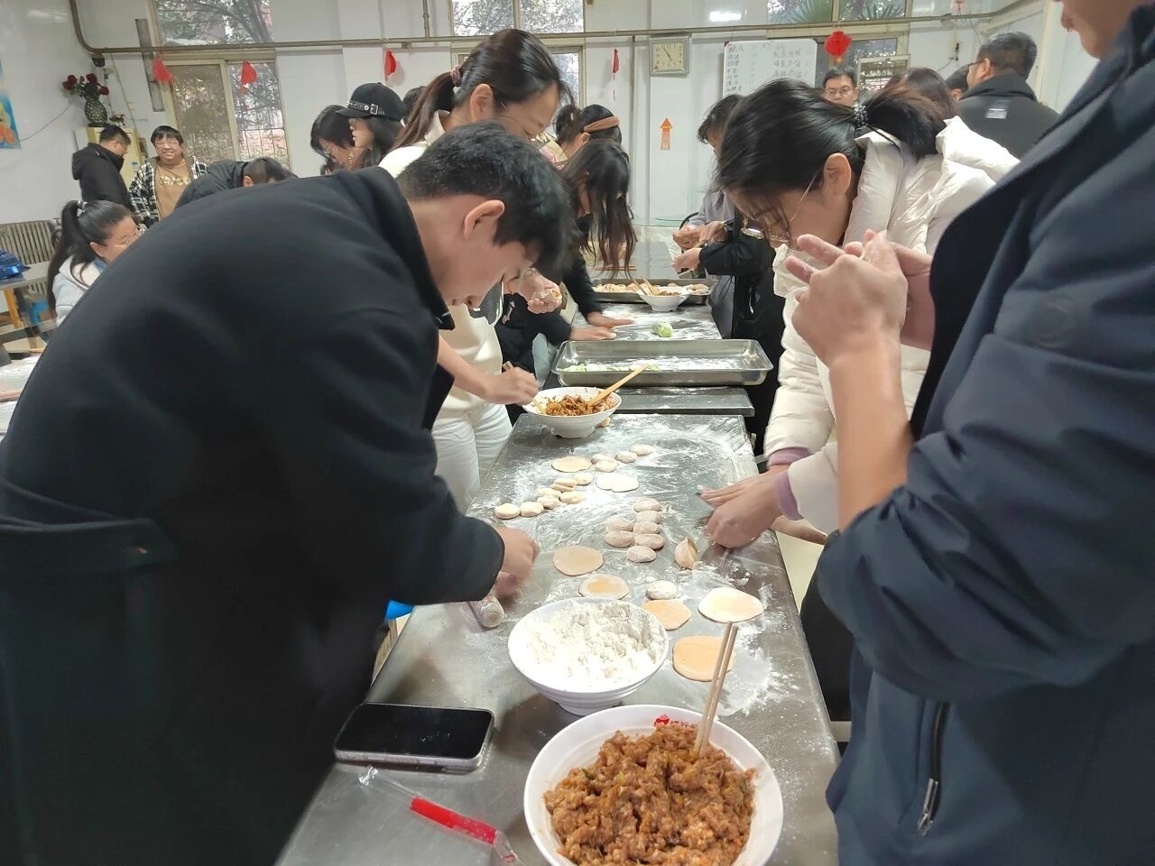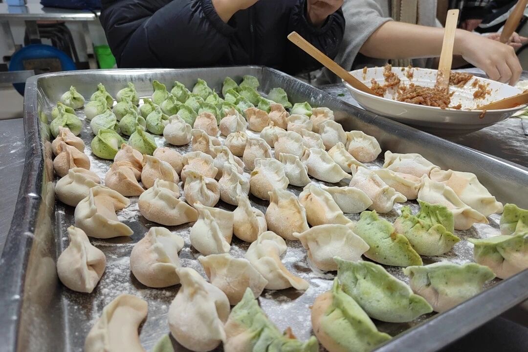 活動中,大家自發(fā)組隊,協(xié)作配合。取皮、填餡、捏合,動作嫻熟,笑語不斷。不一會兒,桌面上便擺滿了造型多樣的餃子,有月牙彎彎,也有創(chuàng)意團團,每個餃子都包進了心意與祝福。
